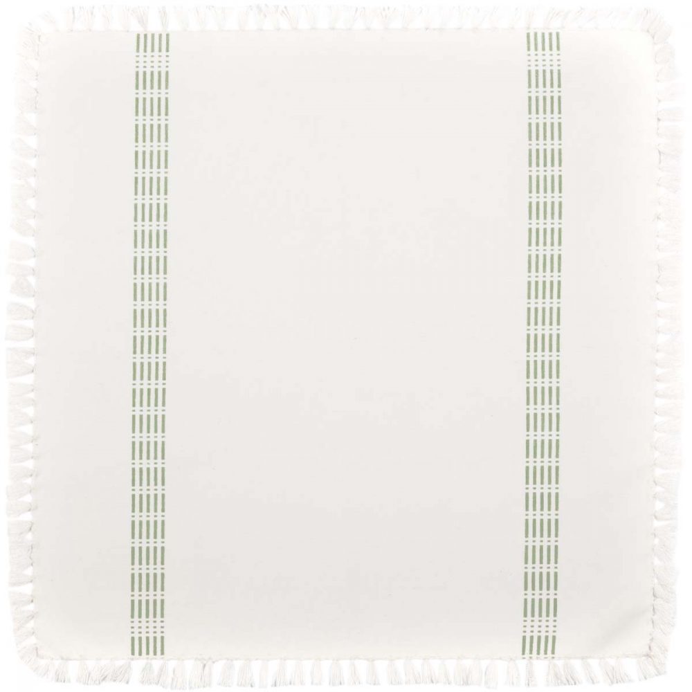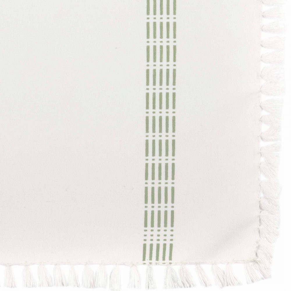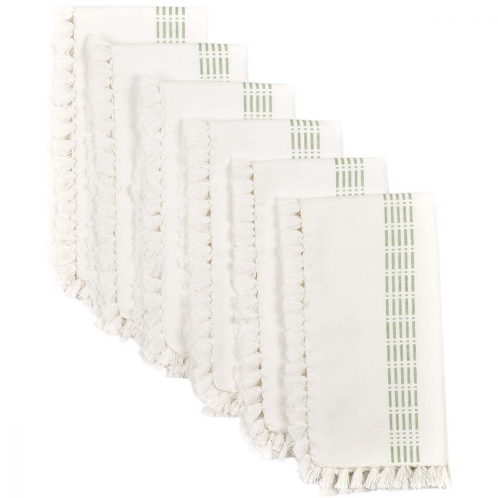 The Madeline Mint Napkin Set of 6 is interspersed with crisp white providing a modern farmhouse look. The 100% cotton set is dominant white with interwoven mint accent stripes and finished with tied tassels for added texture and style.