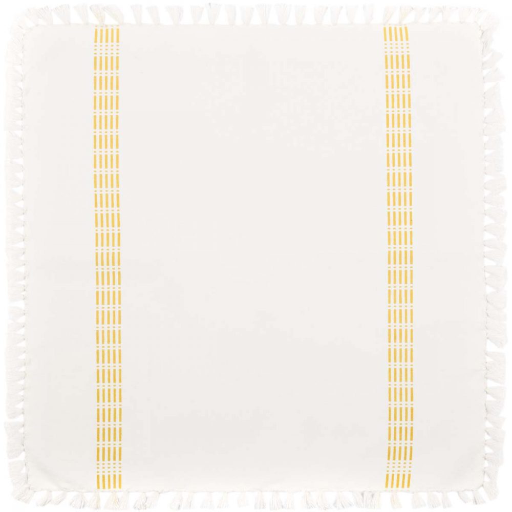 The Madeline Yellow Napkin Set of 6 is interspersed with crisp white providing a modern farmhouse look. The 100% cotton set is dominant white with interwoven yellow accent stripes and finished with tied tassels for added texture and style.