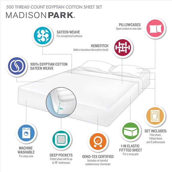 Get the best sleep of your life with this luxurious 500 Thread Count Egyptian Cotton sheet set. Beautifully crafted and specifically tailored for luxurious comfort, each set comes with one flat sheet, one fitted sheet, and two pillowcases. This 100% Egyptian Cotton sheet set features a sateen weave that provides exceptional softness, making it an ideal choice for those who want to drift off into a blissful slumber. We’ve added a snug grip elastic to make sure the fitted sheet is fully secured and fits deep pocket mattresses up to 18″, plus the hemstitch provides an extra touch of luxury. This elegant sheet set is also OEKO-TEX certified, meaning it does not contain any harmful substances or chemicals to ensure quality comfort and wellness. Machine washable for easy care.