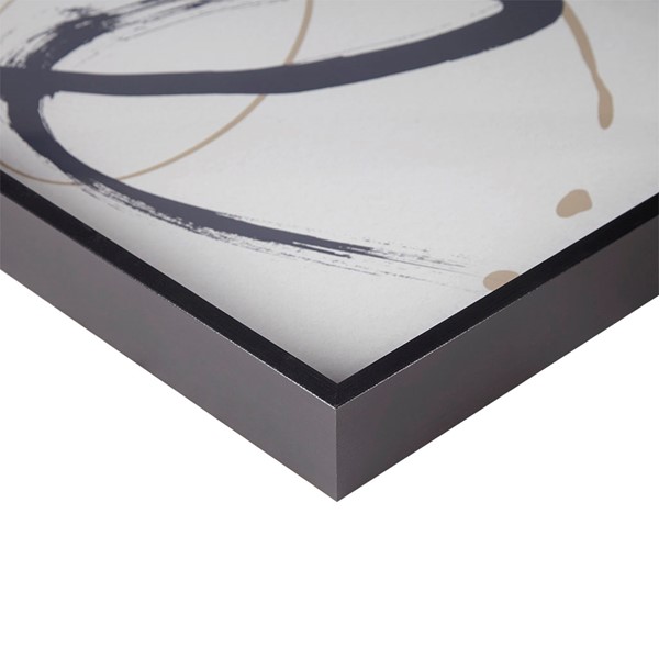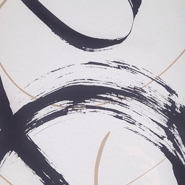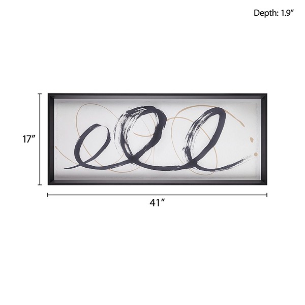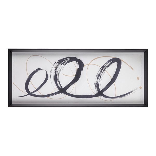 The Madison Park Abstract Ambit Framed Glass Wall Art offers a modern elegance to your home and decor. Bold black and matte gold tone brushstrokes are printed on a light neutral ground and feature deckled edges, for rich texture and an elevated look. The contrasting black frame flaunts a sloped moulding that adds beautiful depth and dimension to this abstract modern wall art. Placed behind glass for an elevated gallery look, this brush stroke wall art uses 4 D-rings on the reverse for easy hanging to bring a refined touch to any space. Comes as a large single piece measuring 41×17″. Spot clean only.