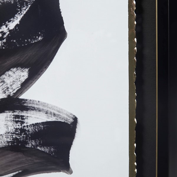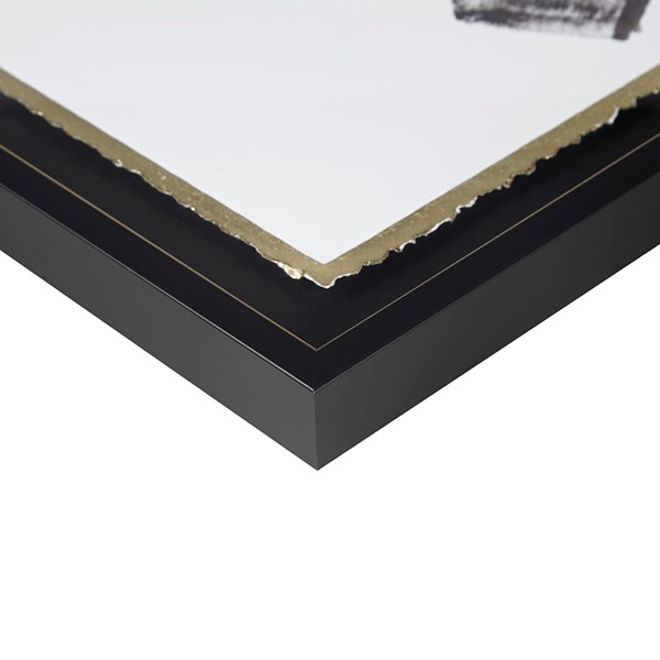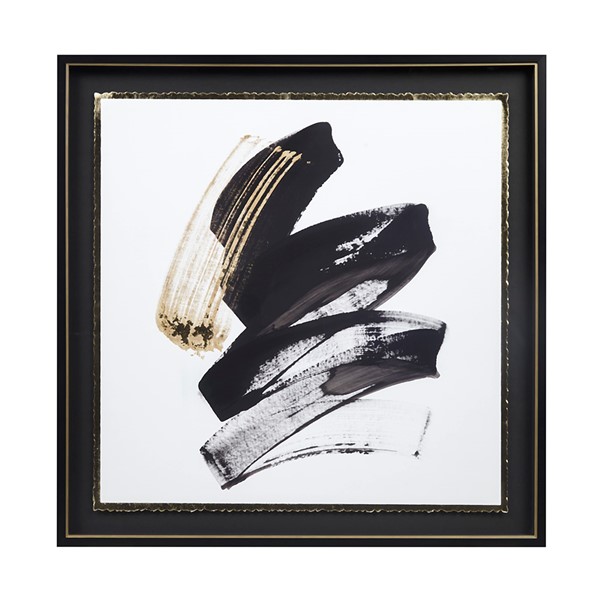Introducing this stunning wall decor piece – a dramatic brushstroke graphic. Printed with gold foil and deckle edges on all sides, the image floats on beveled foamcore and is placed under glass within a double molded frame. The black outlier and gold foiled inner add a touch of elegance to this modern artwork. Elevate your space with this single mat foiled deckle edge float framed graphic.