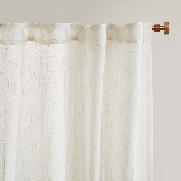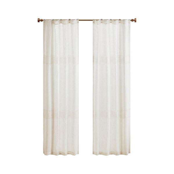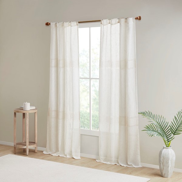 Create a soft and graceful allure in your home with the Madison Park Aida Yarn Dye Sheer Window Panel Pair. This sheer panel pair features a beautiful woven linen texture to create an airy look that drapes softly from your window; while handcrafted detailing creates a beautiful tonal color block pattern, giving each sheer panel a stylish and Boho-inspired touch. A rod pocket top finish makes these panels easy to hang, or hang on back tabs for a more tailored look; each top finish fits up to a 1.25" diameter rod. Machine washable for easy care; this sheer window panel pair is also OEKO-TEX certified, meaning it does not contain any harmful substances or chemicals to ensure quality comfort and wellness.