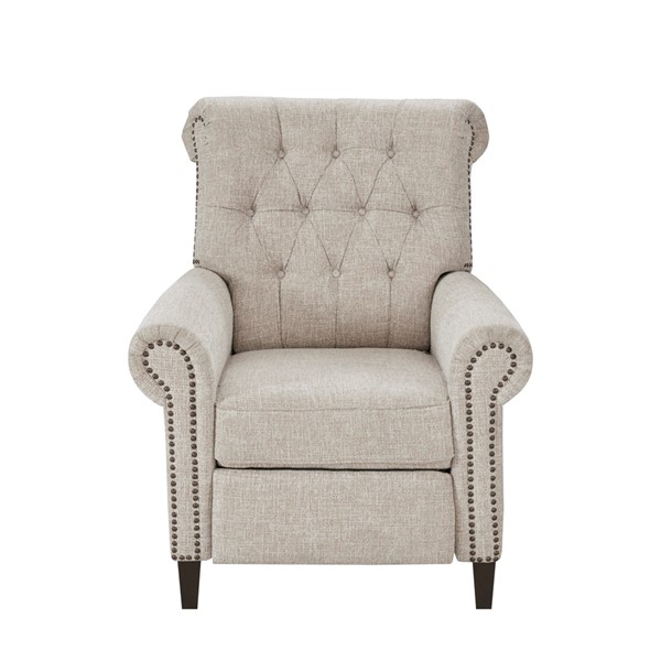 The Aidan Recliner by Madison Park blends classic details with modern versatility. Featuring a rolled back, button tufting, and nailhead trim, it brings timeless charm to any room. The manual push-back mechanism offers three reclining positions for customized comfort. Upholstered in a soft, durable fabric and built with a sturdy wood frame, pocket coils, and solid wood legs, it delivers both style and support. Its compact footprint and cordless design make it easy to place anywhere. Partial assembly required. Add the Aidan to your home for effortless comfort and elegance.