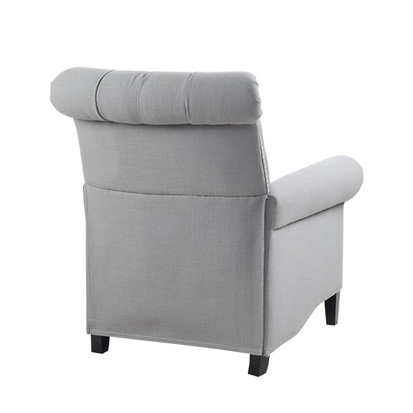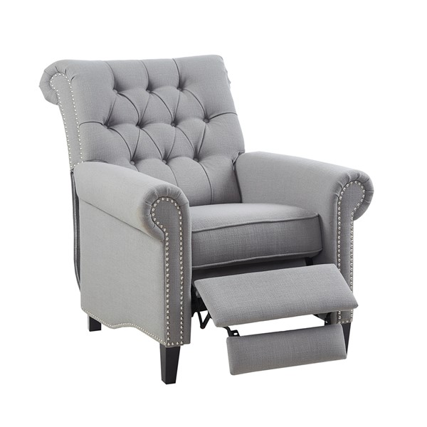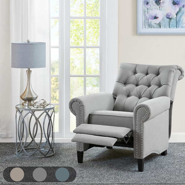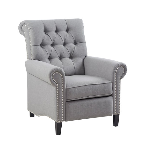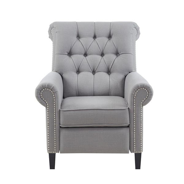 Add a sophisticated touch to your living room with the Madison Park Aidan Push Back Recliner. Featuring a high button-tufted back and rolled arms, this recliner chair is upholstered in a rich grey fabric for a charming transitional look. A pewter nail head trim adds an elegant accent to the design, while a black noir finish on the solid wood legs creates a bold contrast. Make a statement in your living room by incorporating this recliner into your decor and elevate the look of your space with its sophisticated style. Partial assembly required and no tools are needed.