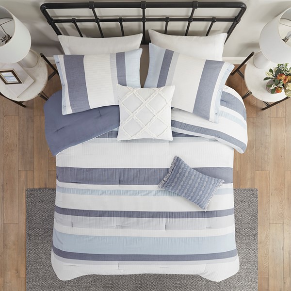 Refresh your bedroom with the casual charm of Madison Park’s Allegany 5 Piece Jacquard Comforter Set. The jacquard comforter features a striped design, in blue, gray, and cream hues with a solid dark blue reverse, for an updated casual look. The matching shams pair handsomely with the farmhouse-inspired comforter, while an oblong and a square decorative pillow add textural elements to the comforter set. Hypoallergenic polyester filling in the comforter and pillows provides exceptional warmth and comfort all through the night. Machine washable for easy care, this jacquard comforter set has an antimicrobial treatment that provides built-in freshness protection, inhibits growth of odor causing bacteria, and keeps the fabric newer, longer. Bedding may come in rolled or compressed packing and will need to be fluffed up. Use a steam iron to help remove wrinkles easier.