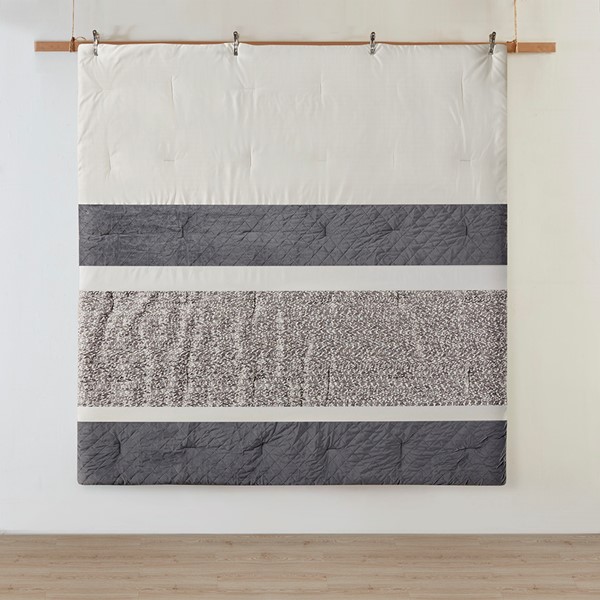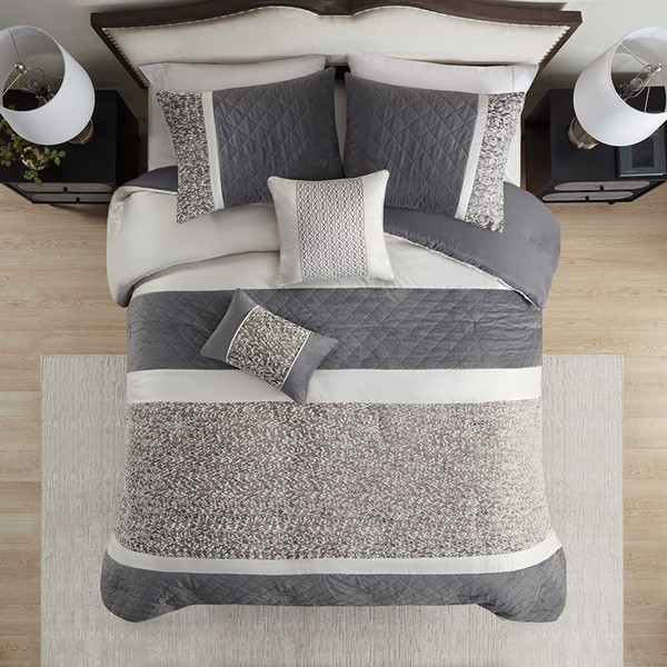 This transitional style comforter set features a boucle textured jacquard fabric pieced with quilted mink and charmeuse that is the perfect modern update to any traditional bedroom. Also included are two decorative pillows featuring either the matching boucle texture design or embroidery details to add a touch of elegance to the overall set. The main colors present is a pewter grey which balances well with the creamy birch tone. Made with 100% hypoallergenic polyester filling, this machine washable bedding set is not only stylish but also practical.