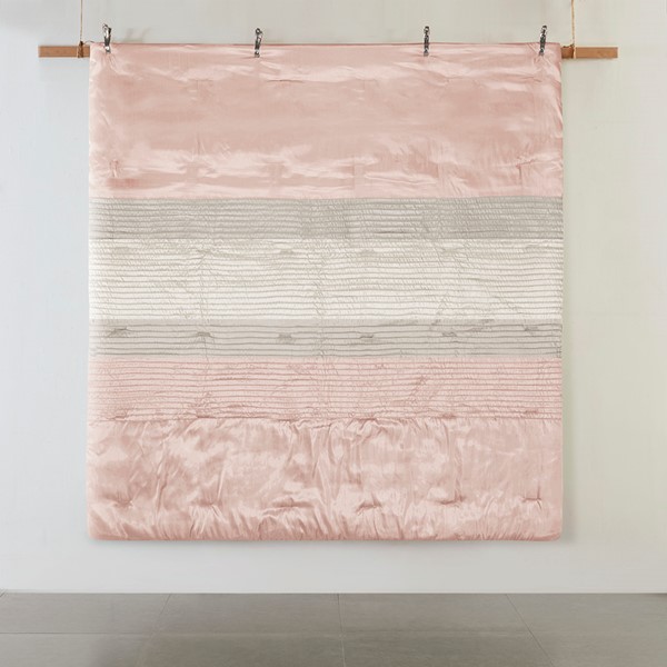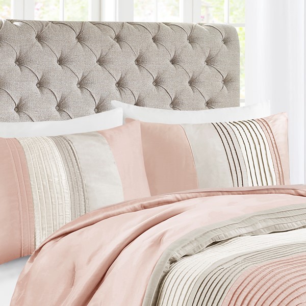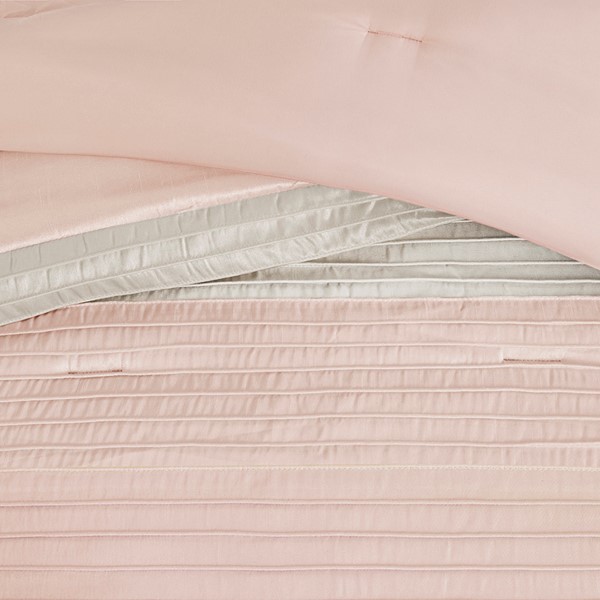 The Madison Park Amherst 7 Piece Comforter Set offers a beautiful update to your bedroom decor. The polyester faux silk comforter and shams features a pieced and pintucked design in blush, ivory, and taupe hues for a chic contemporary look. Two square decorative pillows and an oblong decorative pillow with embroidered and pintucked details complete the top of the bed, while a solid taupe bed skirt provides the perfect finishing touch. Hypoallergenic polyester filling in the comforter and decorative pillows provides exceptional warmth and comfort. Machine washable for easy care, this faux silk comforter set brings a rich and elegant touch to your bedroom.