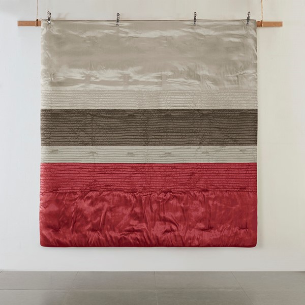 A modern twist to a classic color block bed. Amherst is made from a faux silk texture with pleating details to give it an update to a classic look. Features colors of crimson red, tan and brown.