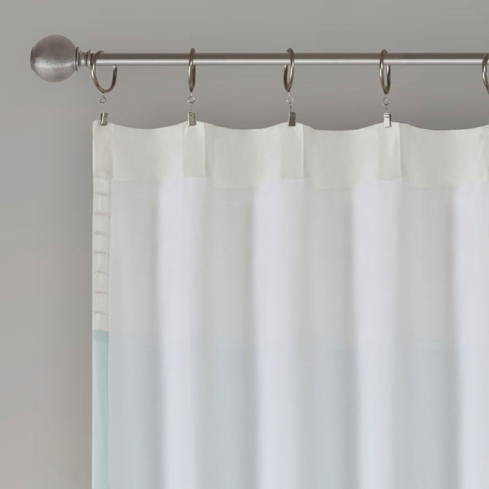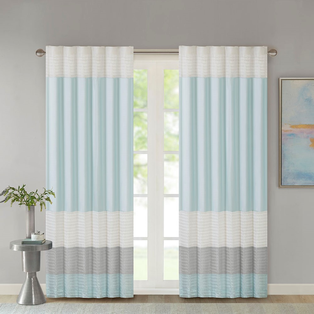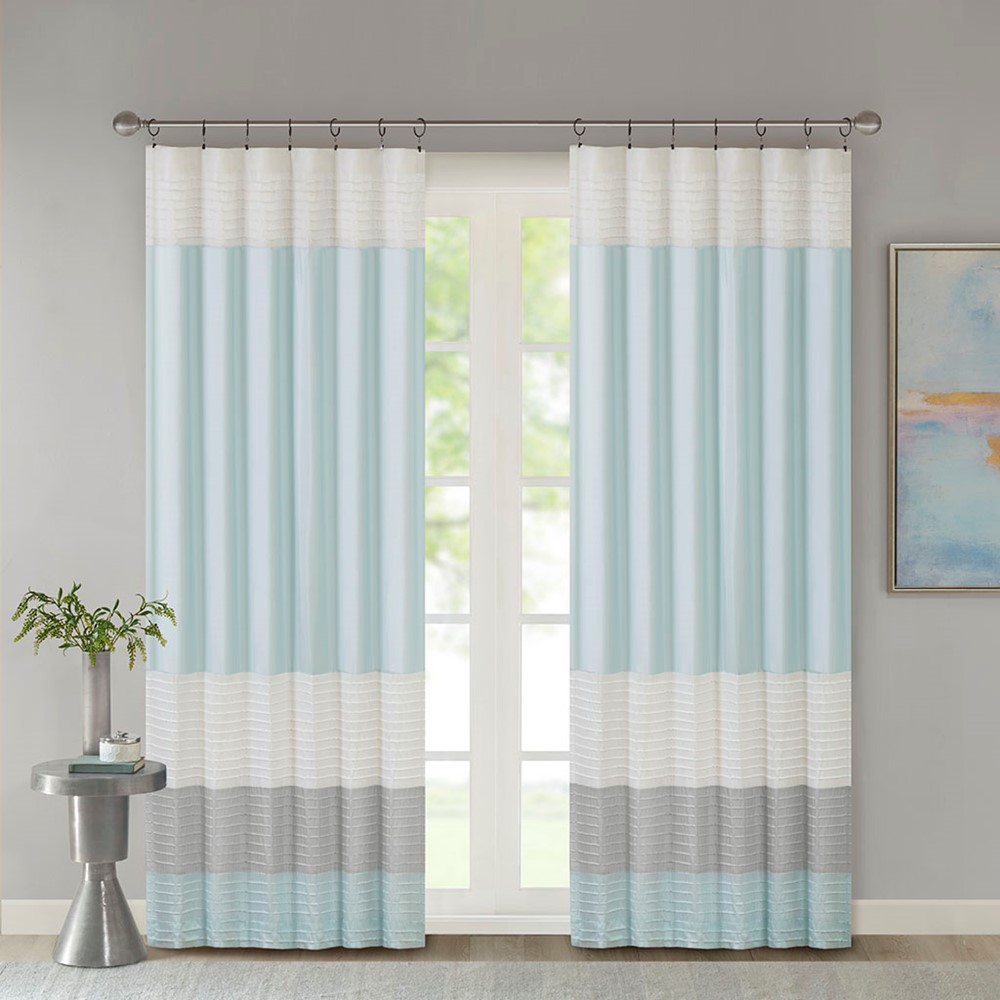 Amherst’s modern color block design is a simple way to add style to your room. This window panel features color block stripes in soft hues of aqua, grey, and ivory combined with pintuck detailing for beautiful texture and dimension. Added lining helps to filter the perfect amount of light and creates a fuller look. Hang using the rod pocket or back tabs for a tailored look. Fits up to 1.25″ diameter rod.