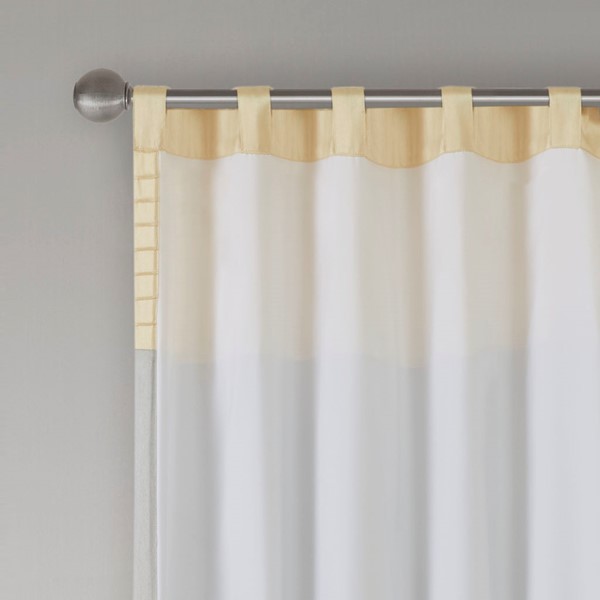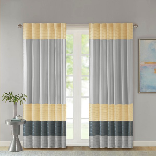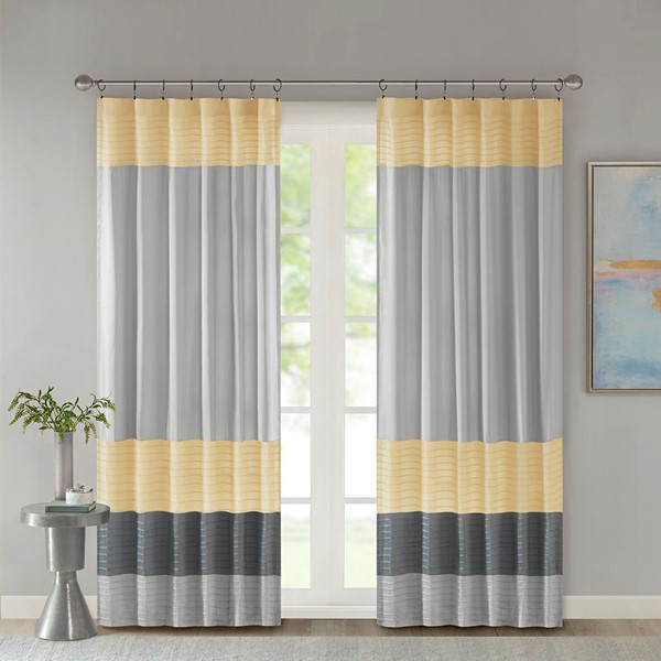 Amherst’s modern color block design is a simple way to add style to your room. This window panel features color block stripes in hues of grey and yellow, combined with pintuck detailing for beautiful texture and dimension. Added lining helps to filter the perfect amount of light and creates a fuller look. Hang using the rod pocket or back tabs for a tailored look. Fits up to 1.25" diameter rod.