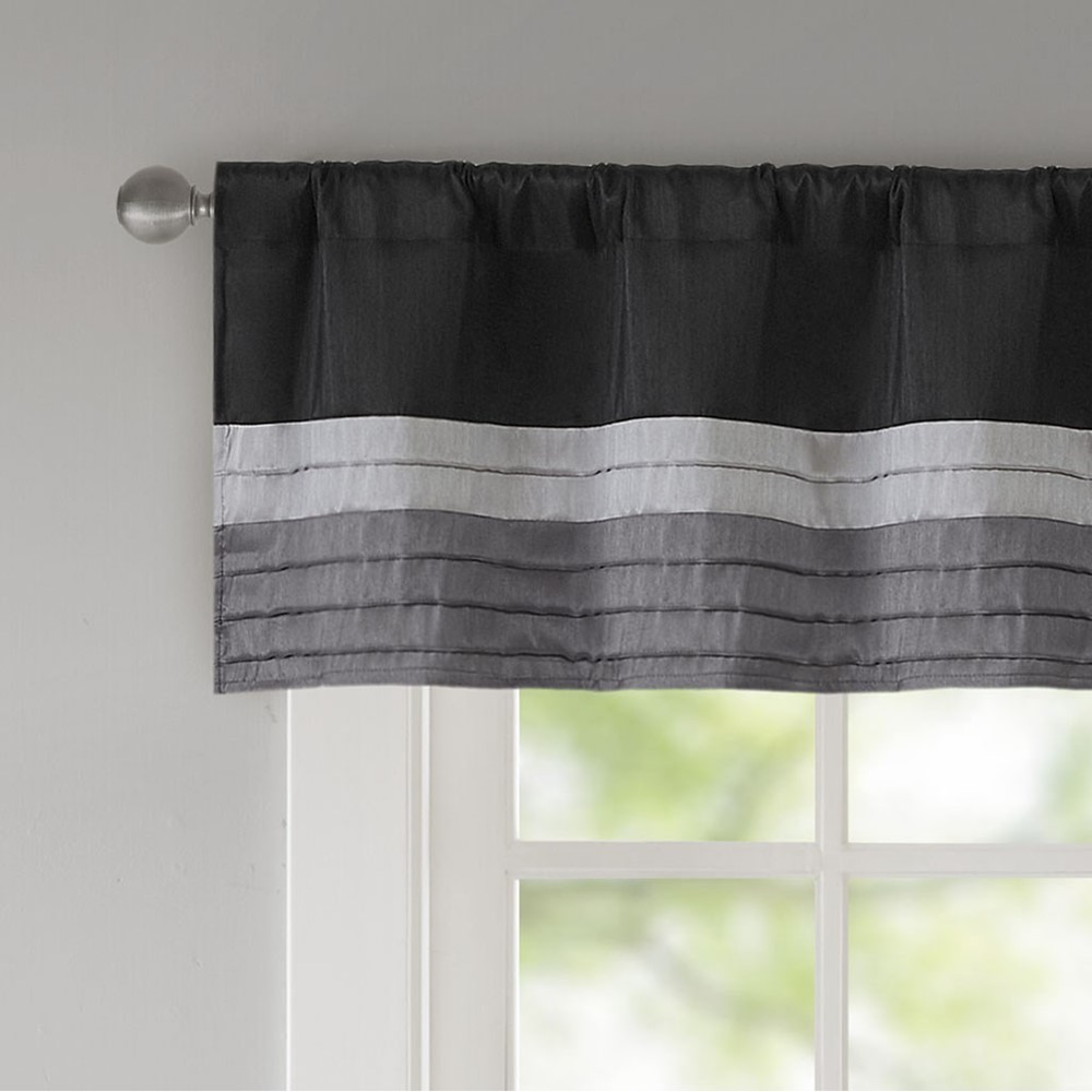 Madison Park Amherst Polyoni Pintuck Window Valance is a simple way to add style to your room. This window valance features a modern striped design in dark hues of black, charcoal, and silver combined with pintuck detailing for beautiful texture and dimension. The added lining helps filter the perfect amount of light and creates fullness for better drapability. Finished with a rod pocket top, this window valance fits up to a 1.25″ diameter rod.