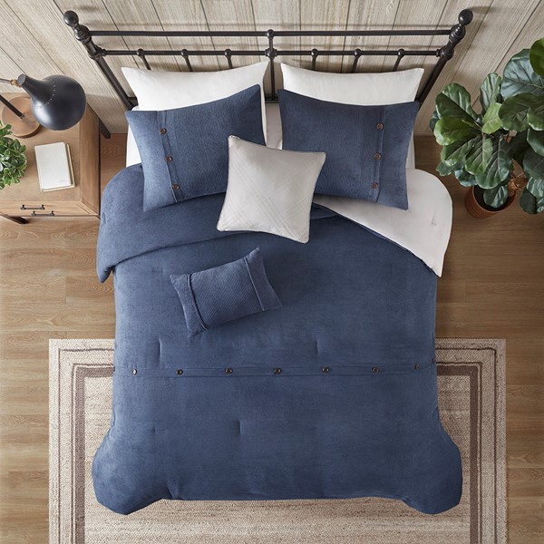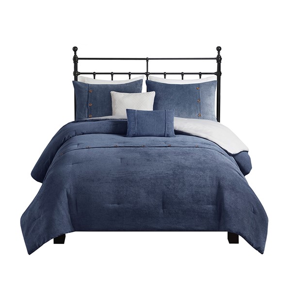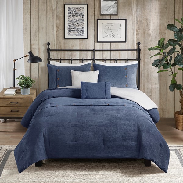 Rich texture, warmth, and elegance are yours when you add Madison Park’s Andes corduroy comfort set to your bed. Made from soft polyester corduroy, this navy comforter features decorative buttons that add a country style accent to the bed. A solid taupe microfiber reverse provides additional softness, while also complementing the lush texture and dimension of the comforter face. Completed with 2 decorative pillows that flaunt quilting and piecing details, this plush comforter set gives your bedroom a cozy and inviting look.
