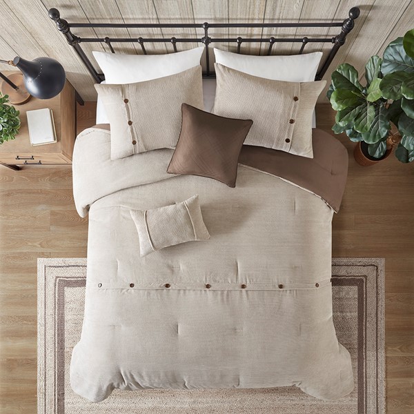 Rich texture, warmth, and elegance are yours when you add Madison Park’s Andes corduroy comfort set to your bed. Made from soft polyester corduroy, this tan comforter features decorative buttons that add a country style accent to the bed. A solid brown microfiber reverse provides additional softness, while also complementing the lush texture and dimension of the comforter face. Completed with 2 decorative pillows that flaunt quilting and piecing details, this plush comforter set gives your bedroom a cozy and inviting look.