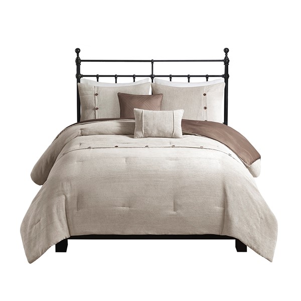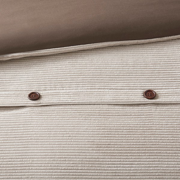 Rich texture, warmth, and elegance are yours when you add Madison Park’s Andes corduroy comfort set to your bed. Made from soft polyester corduroy, this tan comforter features decorative buttons that add a country style accent to the bed. A solid brown microfiber reverse provides additional softness, while also complementing the lush texture and dimension of the comforter face. Completed with 2 decorative pillows that flaunt quilting and piecing details, this plush comforter set gives your bedroom a cozy and inviting look.
