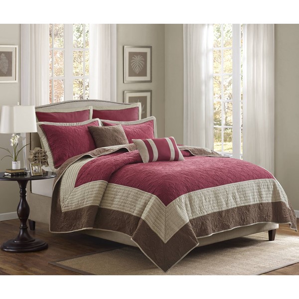 The 7 Piece Reversible quilt set is set in a brown, ivory and red, all working together to create this beautiful colorway. The red and brown portions of the quilt have an intricate woven design that add dimension to this quilt. Made from soft microfiber, this quilt will keep be easy to care for and keep you cozy all year round.