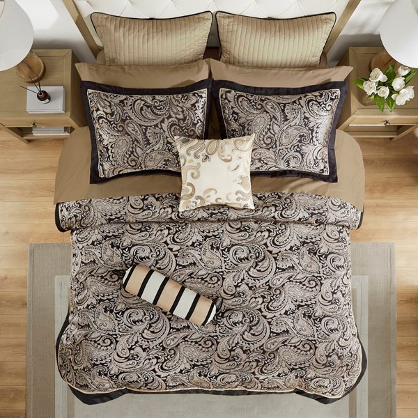 Give your bedroom a classic and elegant look with the Madison Park Aubrey 12 Piece Complete Bed Set including cotton bed sheets. This stunning set features a jacquard weave with a modern paisley pattern in black, gold and silver. The comforter and shams have a 2″ flange and 1/2″ flat piping in soft gold for a refined touch. The comforter reverses to a dark sand shade that complements with the warm brown tones of the 100% cotton, 200 thread count sheet set. This set includes everything you need to create a luxurious and cozy bed. Some items may arrive in compact packaging: just fluff them up or iron lightly and they’re ready to use.