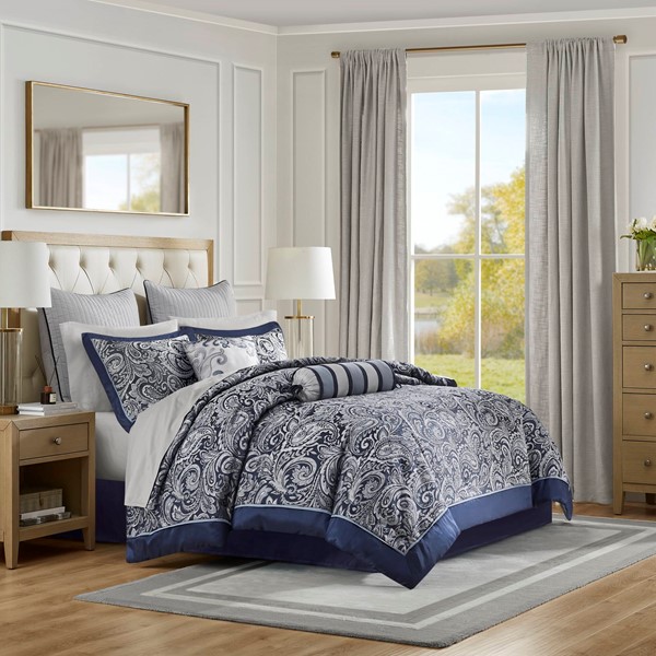 Give your bedroom a classic and elegant look with the Madison Park Aubrey 12 Piece Complete Bed Set including cotton bed sheets. This stunning set features a jacquard weave with a modern paisley pattern in a deep navy, dusty medium blue, and a hint of silver for a touch of sheen to your bedding. The comforter and shams have a 2″ flange and 1/2″ flat piping in a soft blue for a refined touch. The comforter reverses to a dusty blue that complements with the cool grey tones of the 100% cotton, 200 thread count sheet set. This set includes everything you need to create a luxurious and cozy bed. Some items may arrive in compact packaging: just fluff them up or iron lightly and they’re ready to use.