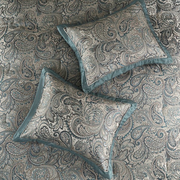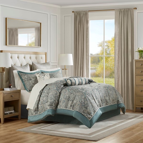 Give your bedroom a classic and elegant look with the Madison Park Aubrey 12 Piece Complete Bed Set including cotton bed sheets. This stunning set features a jacquard weave with a modern paisley pattern in a teal, grey color with a hint of silver for a touch of sheen to your bedding. The comforter and shams have a teal flange and 1/2″ flat piping in a soft grey for a refined touch. The comforter reverses to a grey that complements the ivory tones of the 100% cotton, 200 thread count sheet set. This set includes everything you need to create a luxurious and cozy bed. Some items may arrive in compact packaging: just fluff them up or iron lightly and they’re ready to use.