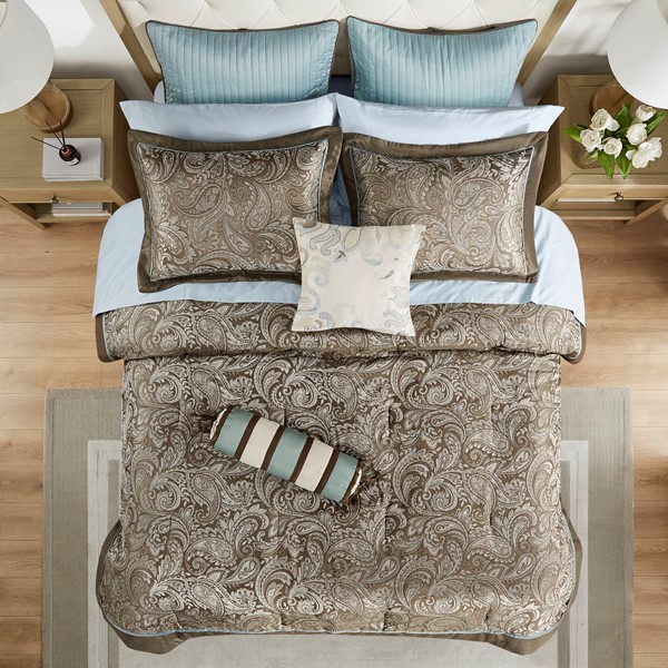 Give your bedroom a classic and elegant look with the Madison Park Aubrey 12 Piece Complete Bed Set including cotton bed sheets. This stunning set features a jacquard weave with a modern paisley pattern in soft blue, taupe, and a hint of platinum for a touch of sheen to your bedding. The comforter and shams have a 2″ flange and 1/2″ flat piping in a soft blue for a refined touch. The comforter reverses to a dark sand shade that complements with the soft blue tones of the 100% cotton, 200 thread count sheet set. This set includes everything you need to create a luxurious and cozy bed. Some items may arrive in compact packaging: just fluff them up or iron lightly and they’re ready to use.