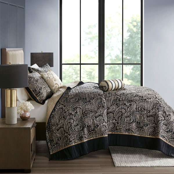 The Madison Park Aubrey 5 Piece Reversible Jacquard Bedspread Set provides a classic update for your bedroom. The jacquard weave is inspired from an updated paisley motif and is woven into a beautiful combination of deep black, gold, and a hint of platinum for a touch of sheen to your bedding. The quilted bedspread and shams offer beautiful details with a black flange and soft gold piping. The reverse is a rich taupe color, while two decorative pillows feature pleating and embroidery details that coordinate with the top of the bed to bring the entire look together.
