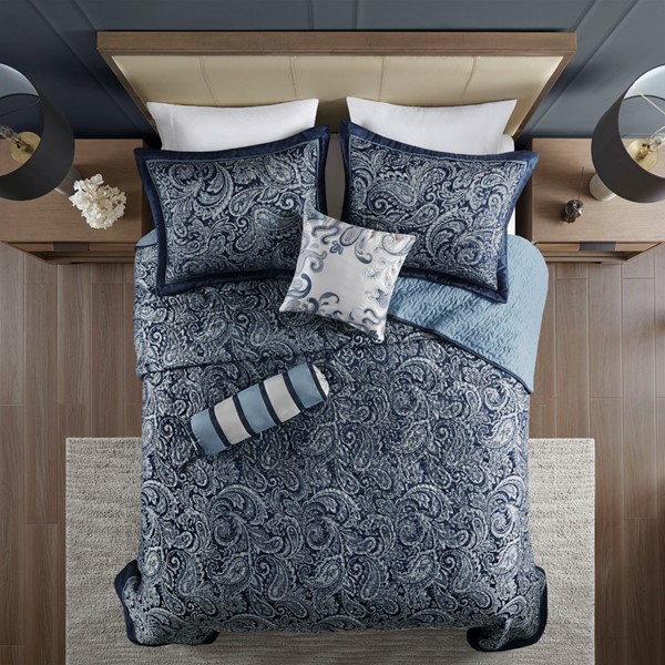 The Madison Park Aubrey 5 Piece Reversible Jacquard Bedspread Set provides a classic update for your bedroom. The jacquard weave is inspired from an updated paisley motif and is woven into a beautiful combination of deep navy, dusty medium blue, and a hint of silver for a touch of sheen to your bedding. The quilted bedspread and shams offer beautiful details with a navy flange and silver piping. The reverse is a dusty blue color, while two decorative pillows feature pleating and embroidery details that coordinate with the top of the bed to bring the entire look together.
