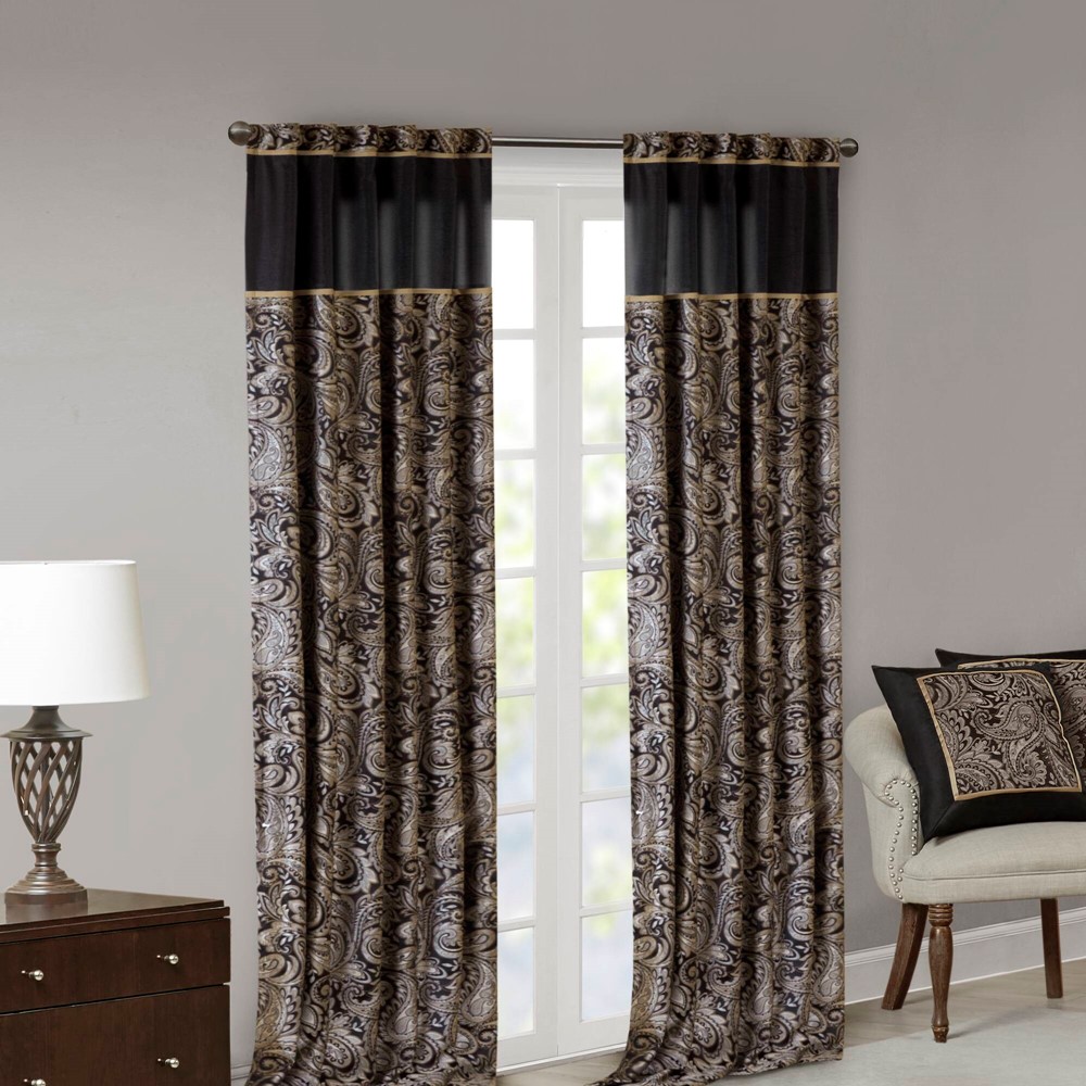 For a luxuriously classic style, our Madison Park Aubrey Window Curtain Pair is the perfect touch to your decor. The alluring jacquard weave is inspired from an updated paisley motif and is woven in beautiful hues of black, gold, and a hint of platinum for a shimmering accent. The window panels are pieced with solid faux silk and beautiful flat piping details in gold, creating an elegant look. While also achieving the OEKO-TEX certification, meaning it does not contain any harmful substances or chemicals, ensuring quality comfort and wellness. Rod pocket or back tabs top finish makes this curtain easy to hang, open, and close panels throughout the day; while fitting up to a standard 1.25″ diameter rod. Coordinating bedding is also available and sold separately.