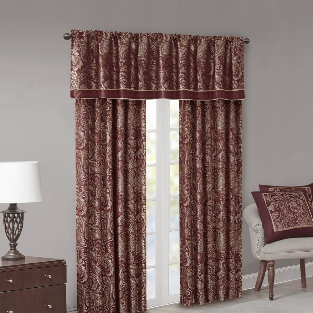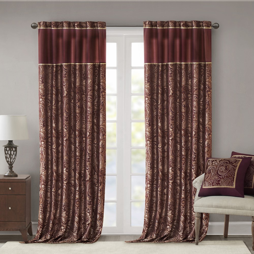 For a luxuriously classic style, our Madison Park Aubrey Window Curtain Pair is the perfect touch to your decor. The alluring jacquard weave is inspired from an updated paisley motif and is woven in beautiful hues of burnt red, gold, and a hint of platinum for a shimmering accent. The window panels are pieced with solid faux silk and beautiful flat piping details in gold, creating an elegant look. While also achieving the OEKO-TEX certification, meaning it does not contain any harmful substances or chemicals, ensuring quality comfort and wellness. Rod pocket or back tabs top finish makes this curtain easy to hang, open, and close panels throughout the day; while fitting up to a standard 1.25″ diameter rod. Coordinating bedding is also available and sold separately.