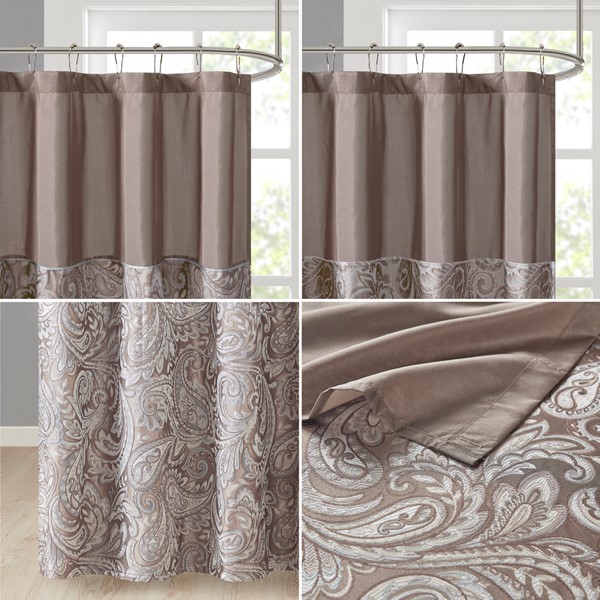 The Madison Park Aubrey Polyester Jacquard Shower Curtain creates a sophisticated modern look in your bathroom. The pieced design flaunts a beautiful woven jacquard in an updated paisley motif with a large solid stripe at the top of the shower curtain. This jacquard shower curtain is machine washable for easy care. Complete the collection and look with coordinate bath towels, bath rugs, bedding, window, and dec pillow – available and sold separately.