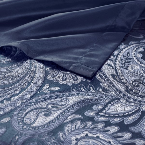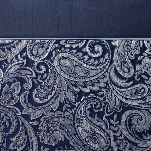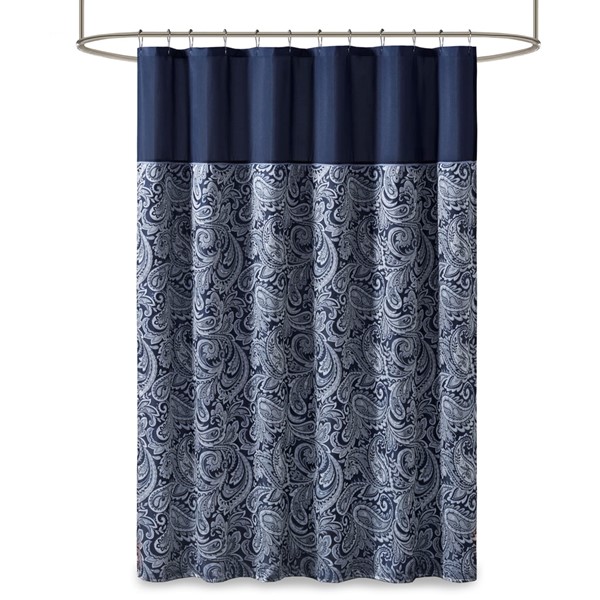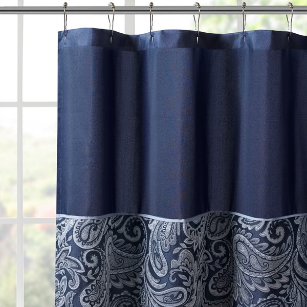 The Madison Park Aubrey Polyester Jacquard Shower Curtain creates a sophisticated modern look in your bathroom. The pieced design flaunts a beautiful woven jacquard in an updated paisley motif with a large solid stripe at the top of the shower curtain. This jacquard shower curtain is machine washable for easy care. Complete the collection and look with coordinate bath towels, bath rugs, bedding, window, and dec pillow – available and sold separately.