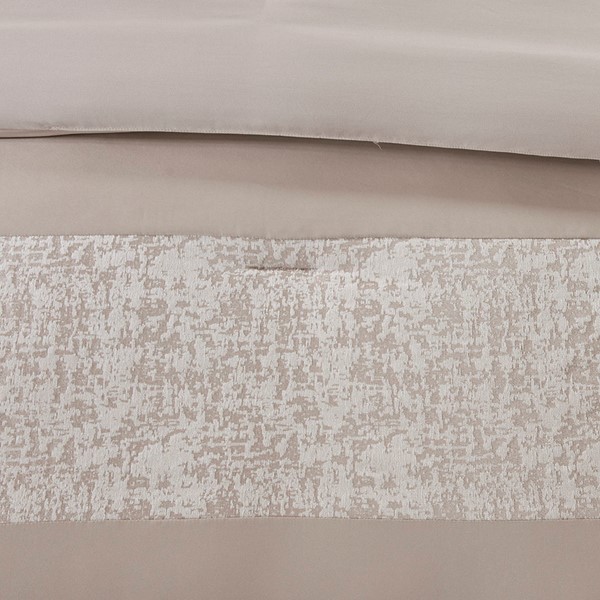 The Madison Park Ava 7 Piece Chenille Jacquard Comforter Set offers a luxurious update to your bedroom decor. The luxurious taupe comforter and shams flaunt a pieced design with stripes of textured chenille jacquard that creates a stunning three dimensional effect. The 2 square decorative pillows and one oblong pillow are stuffed with hypoallergenic filling and feature embroidery and pleating details that provide elegant touches for the top of the bed. A solid taupe bed skirt completes the comforter set, giving the bed a clean finished look. Machine washable for easy care, this chenille jacquard comforter set is machine washable and brings a glamorous allure to your bedroom. Due to the nature of the chenille fabric, some shedding will occur naturally in the first 3-4 washes.