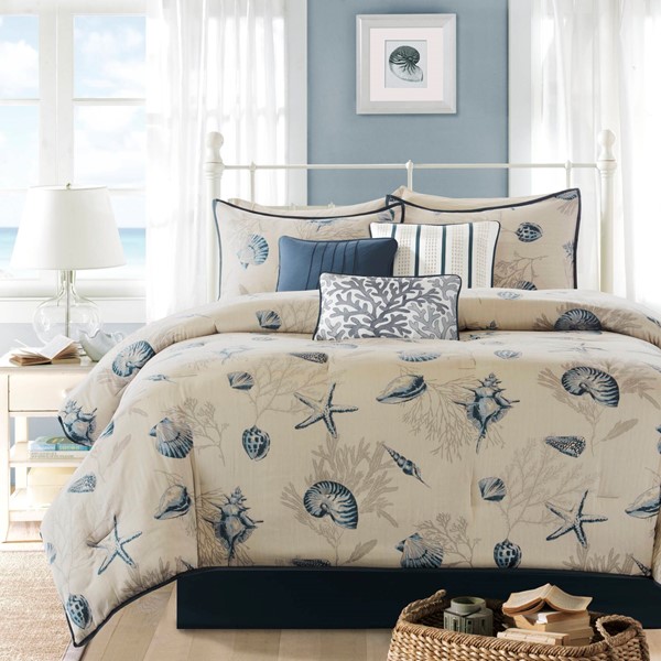 Create a coastal getaway right in your bedroom with the Bayside Comforter Collection. Made from 200 thread count cotton sateen, the comforter and shams feature assorted seashells accentuated with light and dark blue coloring on an ivory background. In a deep taupe color, a coral motif is printed on the background to give another dimension to this pattern. The reverse of both the comforter and shams is the same corresponding dark blue from the face. Three decorative pillows use pleating and embroidery details for added value to this collection.