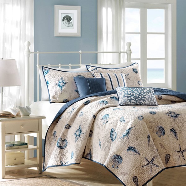 Create a coastal getaway right in your bedroom with the Reversible Bayside Quilt Collection. Made from polyester microfiber the quilt and sham feature assorted seashells accentuated with light and dark blue coloring on an ivory background. In a deep taupe color, a coral motif is printed on the background to give another dimension to this pattern. The reverse of both the quilt and sham is the same corresponding dark blue from the face. Three decorative pillows use pleating and embroidery details for added value to this quilt collection.