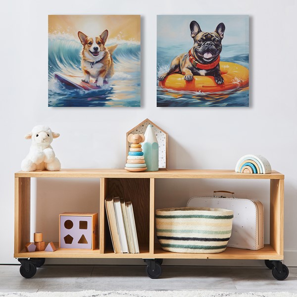 Elevate your space with this charming French bulldog wall art. Featuring a happy bulldog floating in the blue water, this canvas print brings a playful touch to any room. Hang one or multiple of other Beach Dog canvas for your living room, dining room decor. With a pre-installed Sawtooth hanger, it’s ready to hang effortlessly. Created by artist Tessa Kane, this 16"W x 16"H x 1"D piece adds personality and joy to your decor.