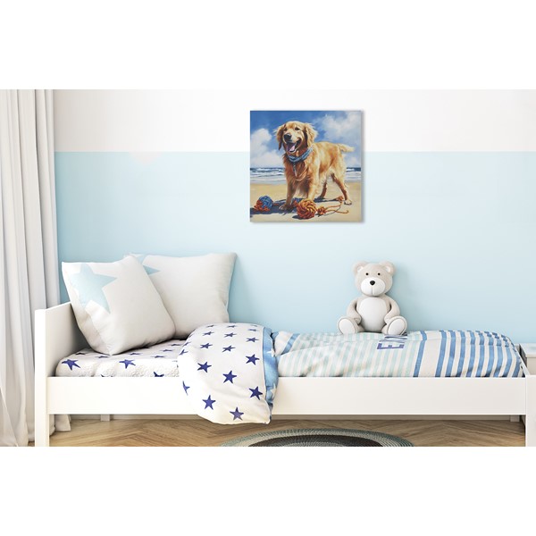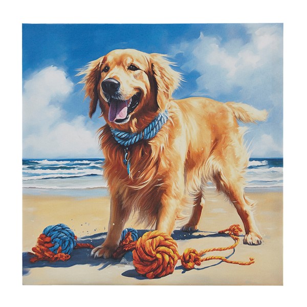 Add a touch of joyful charm to your space with this captivating wall art decor. Featuring a delightful Golden Retriever dog playing on the beach, this canvas print effortlessly captures the spirit of happiness and playfulness. Hang one or multiple of other Beach Dog canvas for your living room, dining room decor. Designed by the talented artist Tessa Kane, this piece is a must-have for dog lovers. With a pre-installed Sawtooth hanger, it’s incredibly easy to hang and enjoy. Perfect for indoor use, simply spot clean to keep it looking fresh. Elevate your home with the warmth and cheerfulness of this Golden Retriever wall art.