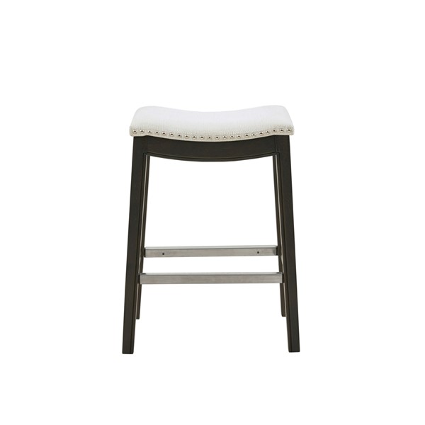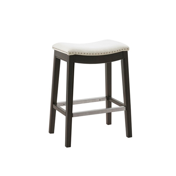 Complete your kitchen dining space with the sophisticated Madison Park Belfast 27.36″ Counter Stool. This counter stool features a cream upholstered seat and a solid wood frame with a dark grey finish to create a stunning contemporary look. A pewter nail head trim around the edge of the upholstery adds an elegant accent, while a metal kickplate on the stretchers protect against every day wear and tear. Flaunting a simple and clean design, this modern counter stool brings an elevate style to your decor. Assembly is required and tools are included.