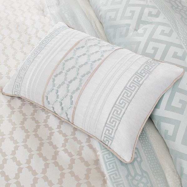 The Madison Park Bennett 7 Piece Jacquard Comforter Set provides a peaceful update to your bedroom with its soft shades of neutral colors. The geometric woven designs adorn this collection working together in large and small stripes for an updated traditional look. Three decorative pillows use embroidery and fabric manipulation techniques for a cohesive look in your space. Items in the set may come in a rolled or compressed packaging, which will need to be fluffed up or steam ironed before use to remove wrinkles.