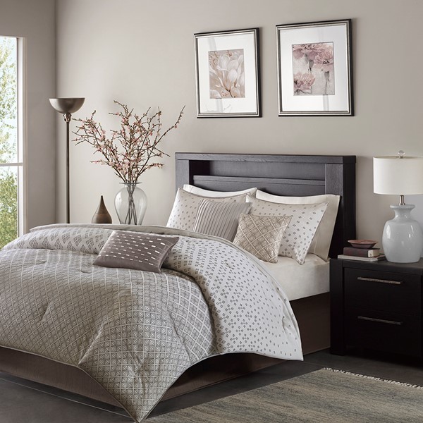 To update your space to a modern look, try the Madison Park Biloxi Collection. Made from polyester jacquard, this unique design is woven to look like sequins. The design has an ombre affect looking heavy in the center of the bed and spreading out towards the top and bottom of the comforter. Two matching shams share this ombre design. Three decorative pillows use unique embroidery and fabric manipulation for the perfect new look for your space. Items in the set may come in a rolled or compressed packaging, which will need to be fluffed up or steam ironed before use to remove wrinkles.