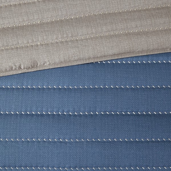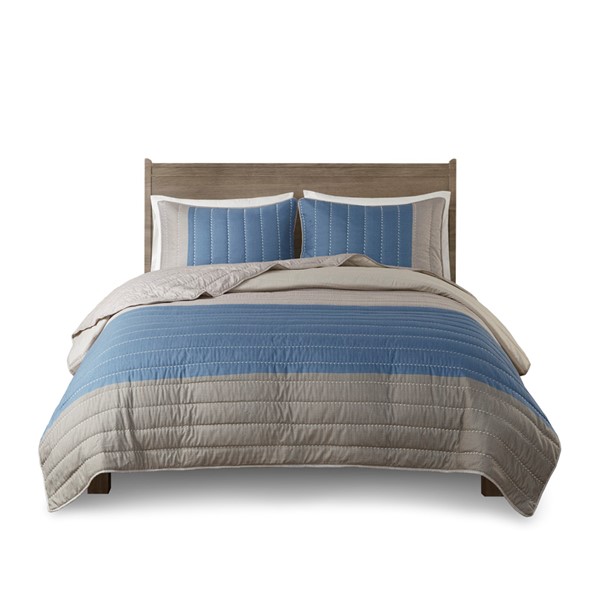 Bring a cozy casual vibe to your bedroom with the Madison Park Blake quilted quilt set. A color block design in soft neutral and blue colors are printed on the face of the quilt and complemented by a solid taupe reverse, for a farmhouse look. The channel quilting adds texture and the polyester filling provides plenty of warmth, making it great for single use in the summer or as an extra layer in the winter.