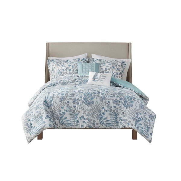 Featuring an all over leafy, floral, botanical print, this seersucker microfiber comforter set exudes a modern farmhouse style that adds a touch of elegance to any bedroom. The two decorative pillows feature gorgeous embroidery that complements the bedding print, adding to the overall charm of the set. Colors featured in this set include various blue, violet, mauve, and whites. The comforter and pillows are filled with hypoallergenic polyester filling that is treated to be dustproof, ensuring a restful and comfortable sleeping experience. This OEKO-Tex certified bedding set can also be machine washed and is extra durable for long lasting comfort.