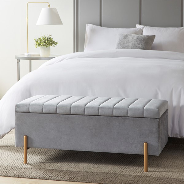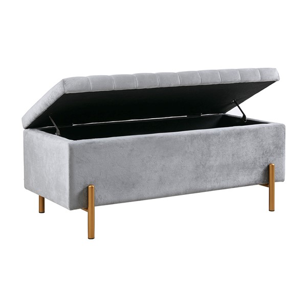 Elegance meets function with the Boyden Upholstered Storage Bench with Gold Metal Legs. Featuring an elegant channel quilting top, this storage bench is upholstered in a lush grey fabric and provides ample storage space for your blankets. The metal legs flaunt a gold finish that adds a luxurious touch to the transitional design, making the storage bench the perfect focal point in your living room. Leg assembly is required and a tool is included.