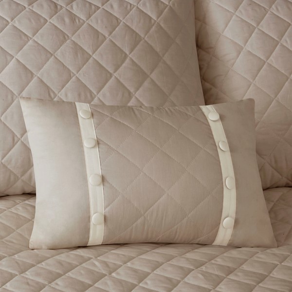 The Madison Park Breanna 4 Piece Cotton Reversible Tailored Bedspread Set provides a luxurious transitional update to your bedroom decor. This oversized khaki bedspread set features a diamond quilting pattern and a button trim that adds a charm and dimension to the bedding set. Matching shams mirror the design of the bedspread for a fully coordinated look, while a decorative pillow provides the finishing touch. Made from 100% cotton percale, this beadspread has a 24-inch drop and is tailored to create an elegant and fitted look.