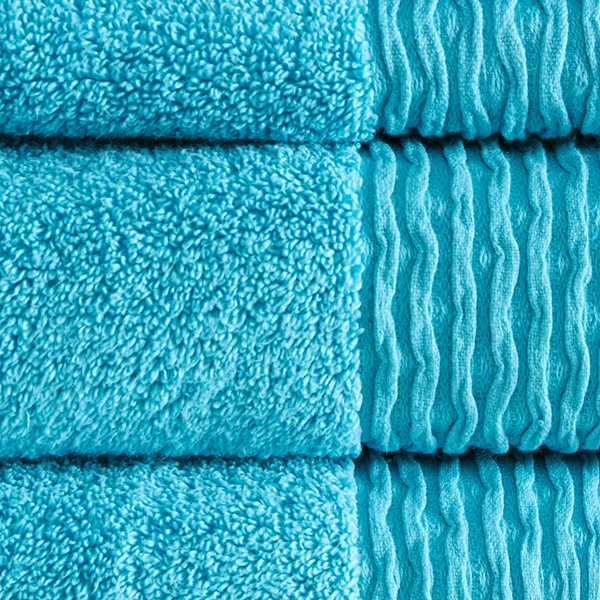 The Madison Park Breeze Jacquard Wavy Border Zero Twist Cotton Towel Set offers a fun and casual update to your bathroom decor. These lightweight towels feature a zero twist cotton yarn construction that is highly absorbent, yet also quick to dry so they are not weighed down by excessive moisture. Each towel also features a durable jacquard wavy border design that adds a simple and stylish finishing touch. Machine washable for easy care, this cotton towel set is also OEKO-TEX certified including no harmful substances or chemicals, for the best in comfort and wellness. Available in a fun, bright color palette – complete the collection with the coordinating Lasso rug, available and sold separately. Set includes: 2 standard 28×52" bath towels, 2 standard 16×26" hand towels, and 2 standard 12×12" wash towels.