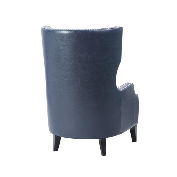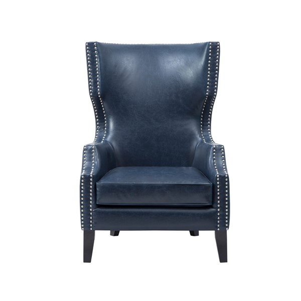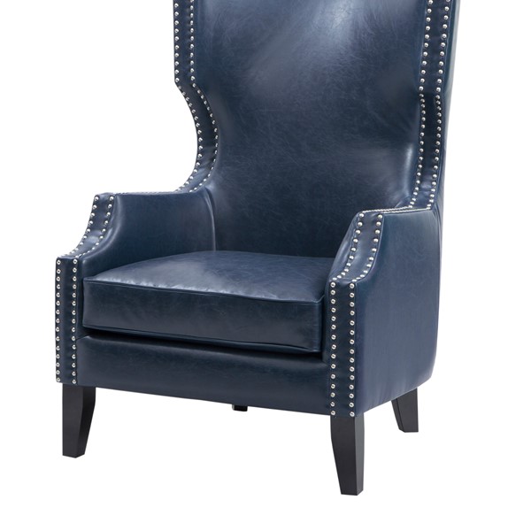This distinguished, modern wing chair offers a stately refuge with its tall, proud back, and enveloping sides. Clean, contemporary lines featured in a navy faux leather with silver nail head trim details. Leg assembly required.