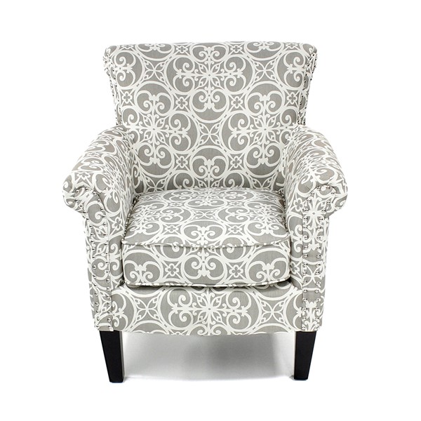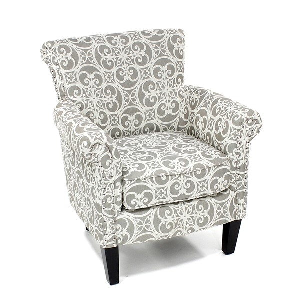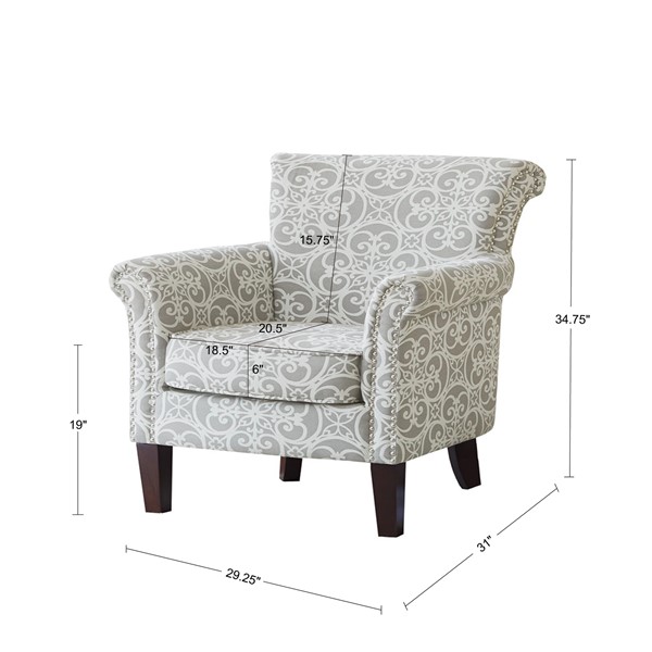 Add an eye-catching touch to your living room with the Madison Park Brooke Tight Back Club Chair. This accent chair features an all-over fretwork pattern on the upholstery that creates a stunning transitional look. The double row nailhead trim on the front of the arms and the sides of the back add an elegant accent to the design. With a comfortable loose cushion and sturdy solid wood legs, this club chair brings a chic style to your home decor. Leg assembly required.