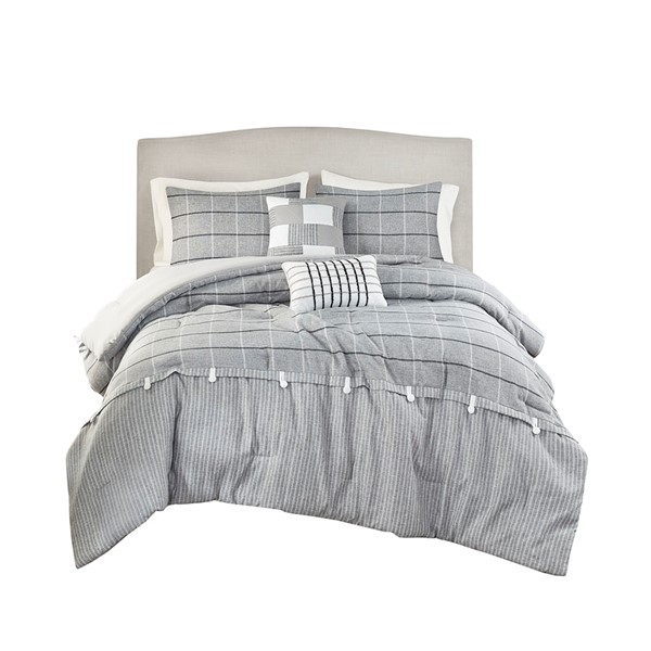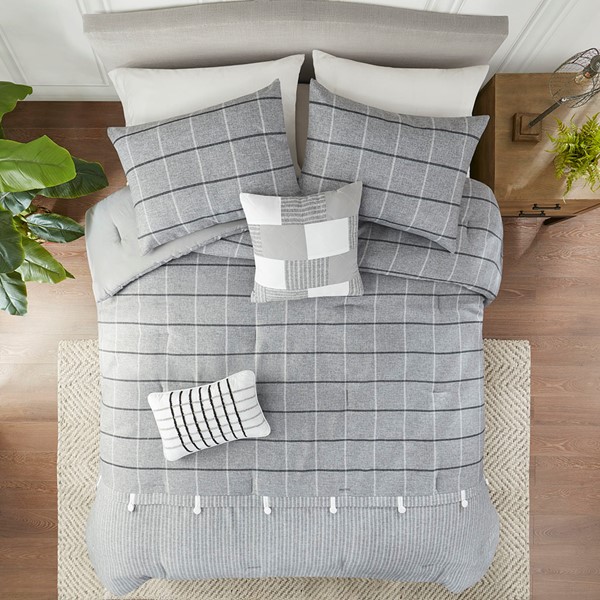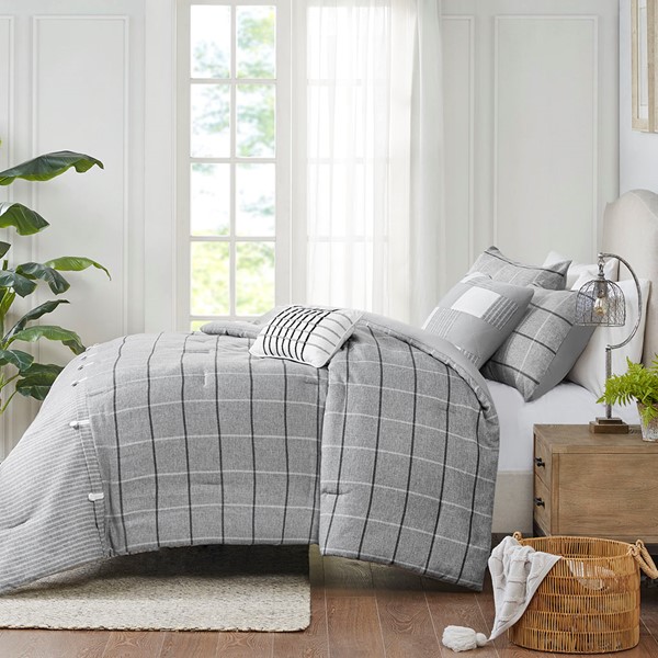 Bring a farmhouse charm to your bedroom with the Madison Park Bryson 5 Piece Comforter Set. Made from brushed buttery soft polyester fabric, this gray comforter features a plaid pattern with decorative buttons to create an upscale casual look. The two matching shams coordinate handsomely with the comforter, while 2 decorative pillows add stylish finishing touches to the farmhouse bedding set. The cottage comforter set also has an antimicrobial treatment that provides built-in freshness protection, inhibits growth of odor causing bacteria, and keeps the fabric newer, longer. Machine washable for easy care, this comforter set easily complements different room styles with its charming design and neutral color.