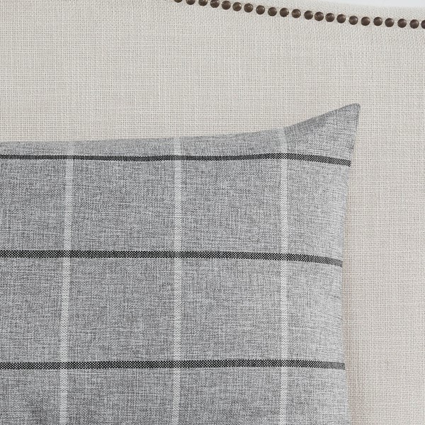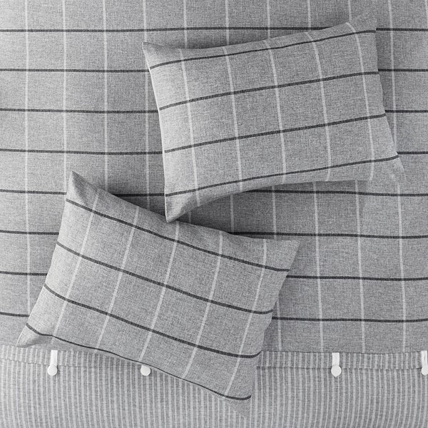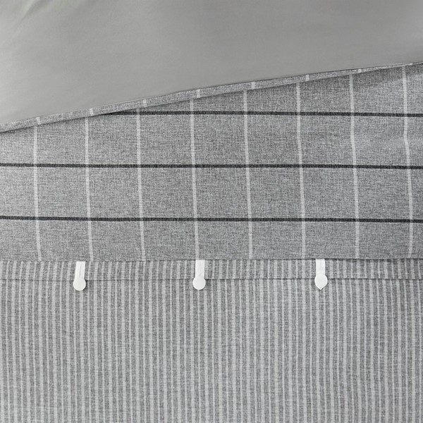 * Plaid pattern pieced with gray stripes on comforter with a solid gray reverse