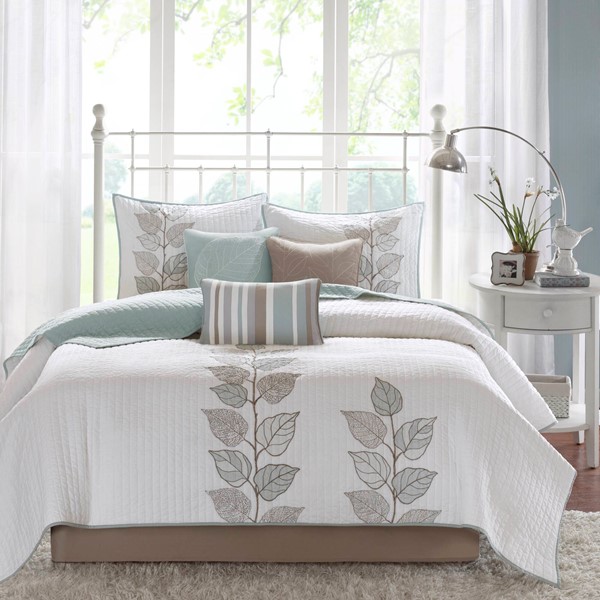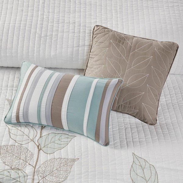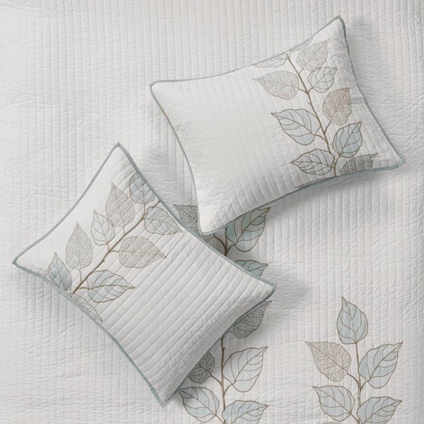This beautiful 6 Piece Reversible quilt set is a classic stylish look with an embroidered leaf print. Caelie is blue and white with subtle stripes that add texture. The quilt reverses to a soft blue. With a microfiber polyester face and a brushed fabric reverse, this quilt is soft to the touch and machine washable for easy care. Two matching standard shams and three embroidered decorative pillows complete the look. Queen size features two rows of embroidery, King size features three rows. Items in the set may come in a rolled or compressed packaging, which will need to be fluffed up or steam ironed before use to remove wrinkles.