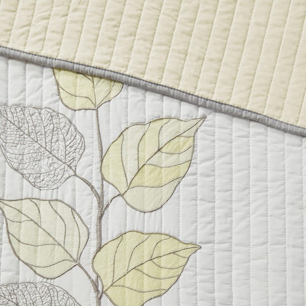 This beautiful 6 Piece Reversible quilt set is a classic stylish look with an embroidered leaf print. The face is yellow and white with subtle stripes that add texture. The quilt reverses to a solid yellow. With a microfiber polyester face and a brushed fabric reverse, this quilt is soft to the touch and machine washable for easy care. Two matching standard shams and three embroidered decorative pillows complete the look. Queen size features two rows of embroidery, King size features three rows. Items in the set may come in a rolled or compressed packaging, which will need to be fluffed up or steam ironed before use to remove wrinkles.