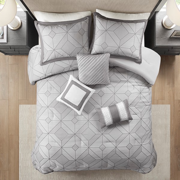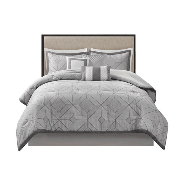 Madison Park’s Cannon 7 Piece Jacquard Comforter Set offers a refined and sophisticated update to your bedroom. This jacquard comforter features gray geometric designs with a soft microfiber reverse that adds comfort, for a chic luxurious look. The two matching shams also showcase a geometric pattern to complement the transitional style comforter. Also included are three decorative pillows and a solid gray bed skirt that add the finishing touches to complete the glam bedding set. Hypoallergenic polyester filling in the comforter and pillows provide exceptional warmth and comfort. Machine washable for easy care, this jacquard comforter set brings an elevated touch to your bedroom decor.