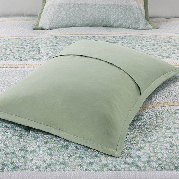 Featuring three different floral and botanical print designs separated by lace trims, this seersucker microfiber comforter set exudes shabby chic/farmhouse style that adds a touch of elegance to any bedroom. The two decorative pillows feature gathered fabric and embroidery with lace trim and ruffles, adding to the overall charm of the set. Colors featured in this set include various shade of greens, yellows, and whites. The comforter and pillows are filled with hypoallergenic polyester filling that is treated to be dustproof, ensuring a restful and comfortable sleeping experience. This machine washable bedding set features an antimicrobial treatment, which inhibits bacteria growth and keeps the bedding fresher for longer.